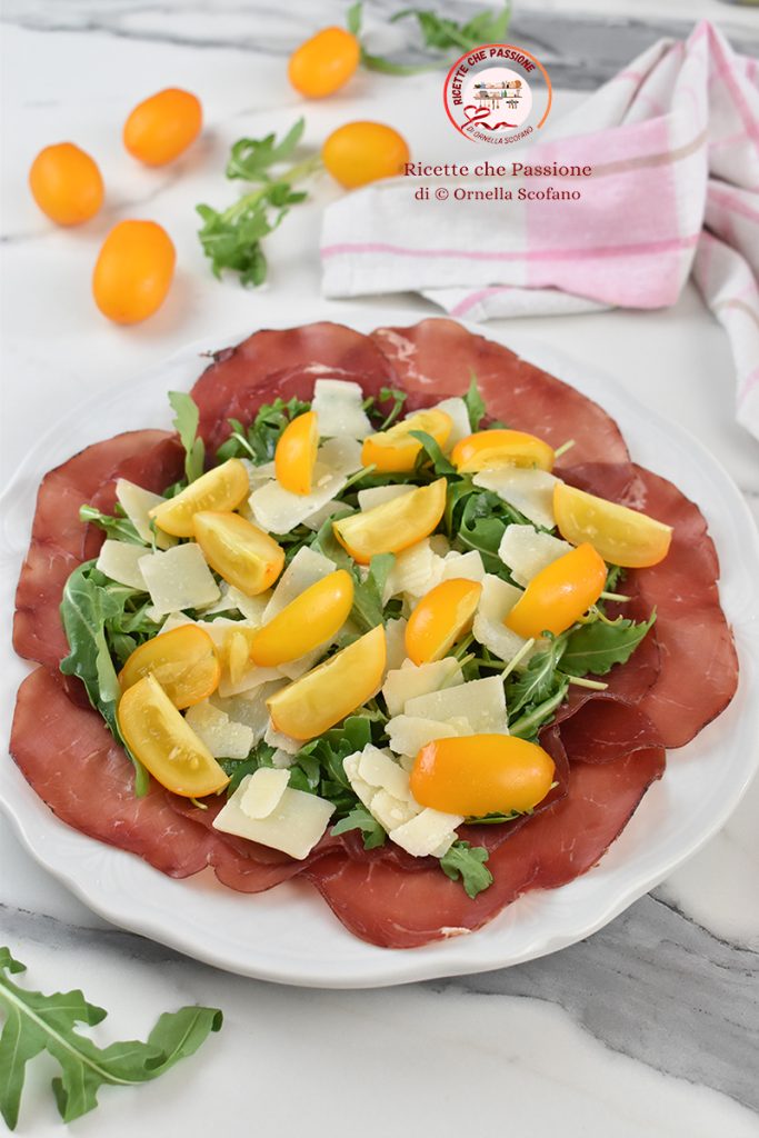 Carpaccio de bresaola avec parmesan roquette et tomates, un beau plat frais, rapide et coloré à mettre sur la table toute l’année, pas seulement pendant les journées les plus chaudes. Il se prépare en un rien de temps sans cuisson et est parfait à la fois comme entrée à servir si nous avons des invités à déjeuner ou à dîner, mais aussi comme plat unique pour un déjeuner ou dîner léger à deux. Le carpaccio de bresaola est délicieux et se déguste avec plaisir tant lors des chaudes journées d’été, mais il est si bon qu’il convient également toute l’année, et ne peut pas manquer pendant les fêtes, il se fait en un rien de temps et plaît toujours à tout le monde, peut-être peut-on ajouter des fruits secs et un peu de miel, ici j’ai mis du jus de citron pour le rendre encore plus frais car il fait encore très chaud ici en Calabre. Voyons donc ce dont nous avons besoin pour préparer le Carpaccio de bresaola.
