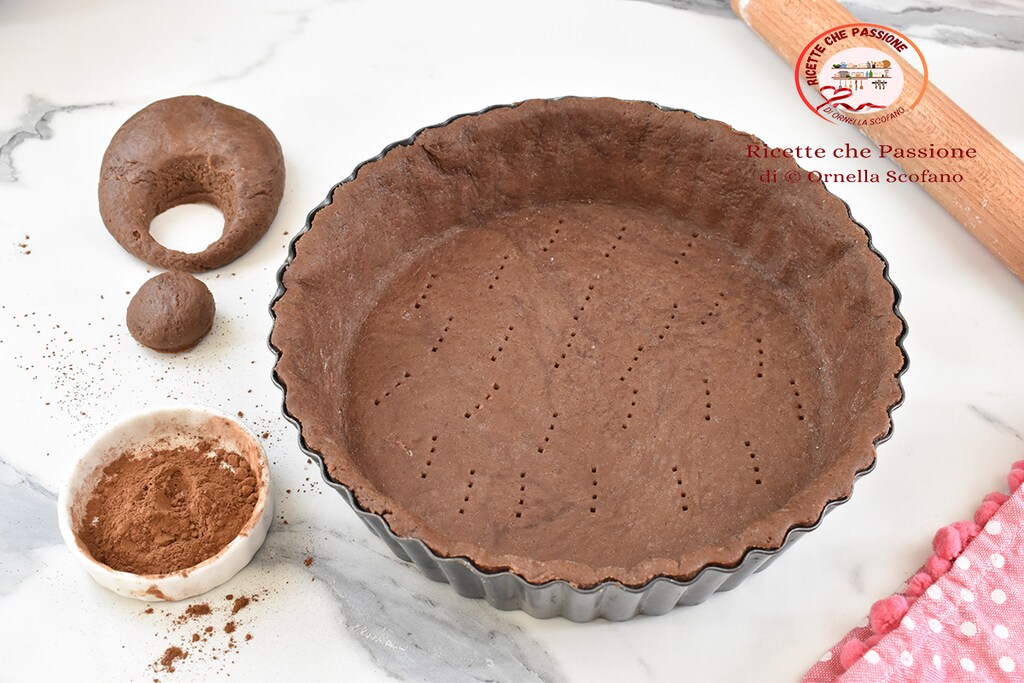 Abaissez la pâte avec un rouleau sur une surface bien farinée, farinez également la pâte et étalez-la finement, pour recouvrir un moule d’environ 24-26 cm de diamètre, de préférence un moule à charnière ou avec base amovible. Étalez la pâte assez large pour recouvrir tout le bord en hauteur.
