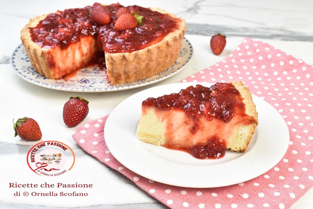 Cheesecake cuite aux fraises, une tarte cheesecake délicieuse, un dessert à servir de breakfast en avant, parfait pour le goûter, délicieux en fin de repas, aussi excellent comme gâteau d’anniversaire, il suffira d’ajouter 2 bougies. Il y a quelques jours, j’ai fait un tour dans une ville à proximité, et après une promenade au parc, j’ai décidé de m’arrêter pour prendre un café dans une pâtisserie, où j’ai vu de belles tartes et je me suis dit pourquoi ne pas essayer une tranche, j’ai pris une tranche de cheesecake cuit, ou tarte cheesecake aux fruits rouges, c’était bon mais il manquait quelque chose, en somme elle ne m’a pas donné le plaisir que j’attendais, tandis que la version au chocolat que mon mari a mangée était vraiment succulente, celle-là je la ferai la prochaine fois, mais pour maintenant, pour satisfaire mon envie insatiable de gourmandise, j’ai voulu refaire ce cheesecake cuit avec une croûte de pâte sablée au beurre, et une garniture gourmande de fromages variés, j’ai utilisé du mascarpone, du fromage à tartiner type philadelphia et j’ai allongé le tout avec un peu de lait, qu’on peut remplacer par de la crème fraîche si on veut. Pour la couverture, j’ai utilisé le plateau de fraises fraîches que j’avais acheté la veille, que j’avais trouvées délicieuses, petites, mûres et très parfumées. Enfin, je peux vous dire que mon envie de cheesecake a été satisfaite, un vrai plaisir que je veux partager avec vous et que vous pouvez tous refaire car c’est très facile.