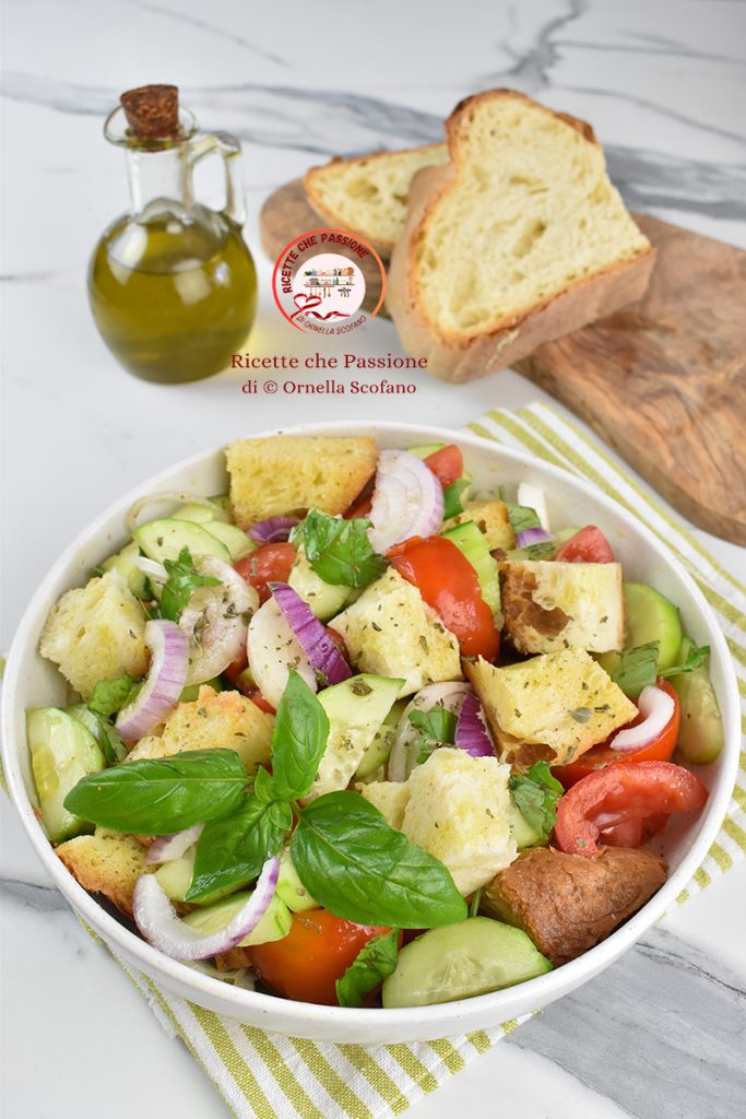 Assaisonnons avec du sel, de l’origan, beaucoup de basilic frais haché à la main et enfin beaucoup d’huile d’olive extra vierge. Un bon mélange et notre salade froide de pain à la materana est prête, la cialledda. Excellente à servir comme entrée, mais je la prépare aussi les jours de grande chaleur comme plat unique, peut-être avec l’ajout d’une mozzarella ou d’un peu de poulet grillé.