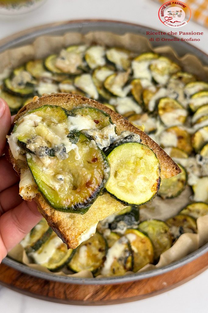Courgettes gratinées au fromage avec mozzarella et gorgonzola, très savoureuses, rapides et délicieuses au four, elles sont une entrée, un accompagnement ou un plat unique accompagnées de croûtons de pain à l’ail. J’avais des courgettes tristes dans le frigo et j’ai eu l’idée de les rendre plus joyeuses, gratinées au four, puis comme j’y étais, puisque je voulais un dîner léger, j’ai ajouté un peu de fromage et en un rien de temps j’ai transformé des courgettes tristes en un plat vraiment délicieux. Excellent plat unique servi avec des croûtons, pour 2 personnes, ou comme entrée pour 6 personnes ou accompagnement pour 4. Le pain est enfourné avec les courgettes, et ainsi en un rien de temps, on prépare un délicieux dîner, mais évidemment même pour le déjeuner c’est un plat parfait pour accompagner les pâtes.
