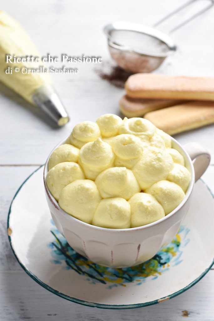 Crème au mascarpone parfaite, sans œufs crus, avec des œufs pasteurisés, avec vidéo recette étape par étape pour préparer la crème la plus gourmande au monde, la mythique crème tiramisu, celle dont vous avez besoin pour faire un bon tiramisu le dessert italien le plus connu et aimé dans le monde entier, avec des œufs pasteurisés. Préparer la crème au mascarpone est très simple, mais on se trompe souvent, vous savez pourquoi, parce qu’on est pressé. Je vous conseille de prendre 10 minutes, oui maximum 10 minutes le temps de préparer une délicieuse crème au mascarpone pour tiramisu. Il est important de garder à l’esprit les petites étapes séquentielles pour obtenir une bonne crème et en peu de temps. Par exemple, monter d’abord les blancs d’œufs pour que, avec les fouets sales, nous n’ayons pas de problème pour monter les jaunes, et oui, un petit truc qui nous fera gagner du temps, car vous savez sûrement que les blancs d’œufs doivent toujours être montés avec des fouets bien propres sinon ils ne montent pas parfaitement, et si vous ne le saviez pas avant, maintenant vous le savez. Je vois souvent des tiramisus désastreux, ça ressemble à une soupe, une bouillie, au fond il y a un mélange de café et ce qui était une fois des biscuits, sont un tout avec la crème qui pauvre reste aplatie au fond comme si elle voulait s’échapper par-dessus les boudoirs, ces petits êtres pestiférés qui ne lui facilitent pas la vie. Savez-vous pourquoi la crème coule tout au fond ? Parce que dès le départ elle a été mal préparée, trop liquide, ça arrive, vous savez, quand les blancs d’œufs sont mal incorporés, par exemple quand on utilise le fouet électrique, et oui le fouet électrique dans cette phase ne s’utilise pas. Vous me demandez souvent comment pasteuriser les œufs pour le tiramisu, parce que vous ne voulez pas prendre de risques en mangeant des œufs crus, donc pour éviter tout danger, et éviter la redoutée salmonelle, j’ai pensé à réaliser une délicieuse crème pour tiramisu sans œufs crus avec des œufs pasteurisés, alors voyons ensemble comment la préparer. Si vous voulez, vous pouvez aussi essayer la crème pâtissière au mascarpone, sans œufs crus.