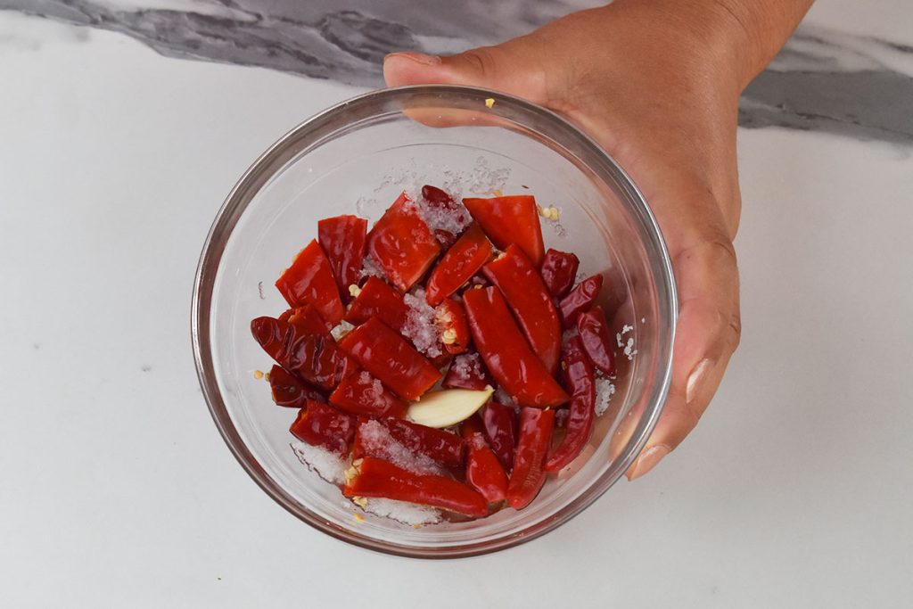2. Nous les mettons dans un bol, ajoutons le sel, mélangeons et couvrons avec un poids. Laissons reposer au moins 12 heures. N’oublions pas la gousse d’ail, nous l’ajoutons avec les piments et laissons également l’ail sous sel.