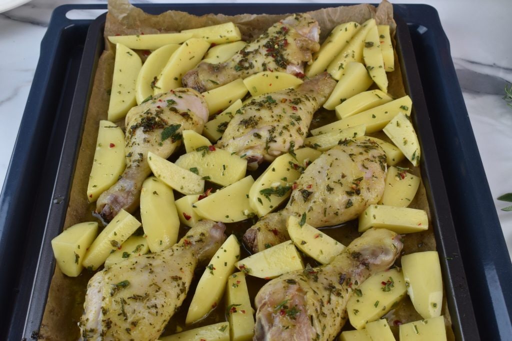 Cuisses de poulet avec pommes de terre prêtes à cuire pendant 45 minutes