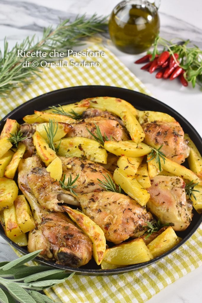 Cuisses de poulet rôties avec pommes de terre au four, saviez-vous que c’est le plat principal préféré des Italiens, celui qui le dimanche s’invite sur les tables avec ses parfums et saveurs toujours renouvelés en fonction des arômes et épices utilisés pour le cuisiner. Le poulet rôti peut être préparé de millions de façons différentes, mais il est presque toujours accompagné de pommes de terre, vous l’avez sûrement remarqué vous aussi, poulet et pommes de terre sont le couple parfait, presque comme Laurel et Hardy (légendaires). Le poulet rôti peut être préparé au four, autrefois la cuisson au four à bois était courante dans les campagnes, avec le progrès le four à bois a été remplacé par le four électrique, mais il peut aussi être préparé sur la cuisinière, à la poêle, comme la plupart d’entre nous le font généralement, mais aujourd’hui je vous le propose au four, encore plus simple car il est prêt à être servi sans avoir besoin de surveillance constante. Je me souviens que quand j’étais enfant, ma mère le préparait souvent, cuit à la poêle, et à la fin, après avoir cuit le poulet, elle cuisinait aussi les pommes de terre dans les graisses résiduelles, elles formaient une croûte dorée délicieuse. En grandissant, j’ai appris à le préparer comme ma mère, je me souviens avec nostalgie des dimanches à la maison, quand je me portais volontaire pour cuisiner moi-même, je me souviens encore de la première fois, j’avais 12 ans, combien j’aimais apporter à table les plats traditionnels avec un peu d’originalité et surtout voir toute la famille heureuse à table, ravie de déguster un bon repas, et j’étais doublement heureuse car c’est moi qui l’avais préparé, et le poulet rôti avec des pommes de terre était un de ces plats présents sur notre table du dimanche de fête. Même si, adulte, je varie un peu plus les plats que je propose à table, je ne vous cache pas que maintenant, je voudrais vraiment me retrouver dans ces moments assis tous ensemble à table à déguster le repas préparé par maman, avec ses légendaires lasagnes grillées et le poulet rôti avec pommes de terre en deuxième plat.