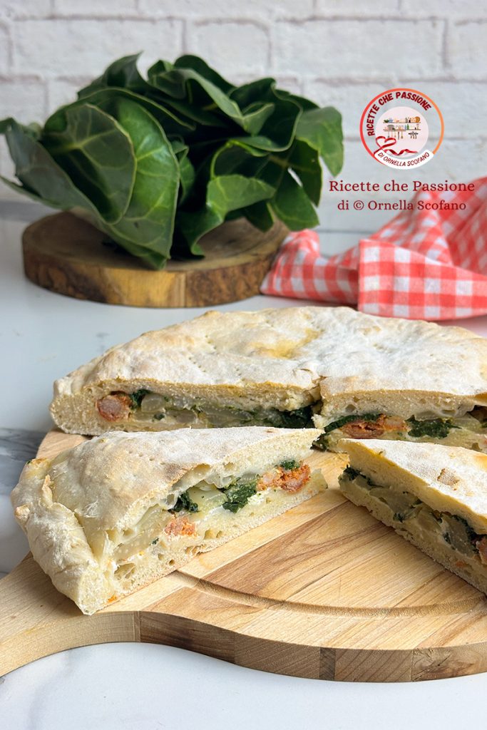 Focaccia farcie avec bette, ricotta et saucisse calabraise, une focaccia rustique très facile à préparer et délicieuse. On part d’une simple pâte pour pain ou pizza, seulement de la farine, de l’eau, du sel et un peu de levure. Pour la garniture, on prépare les bettes blanchies et rapidement sautées à la poêle, bien égouttées, on les laisse refroidir et on les utilise pour farcir la focaccia avec de la ricotta de brebis et de la saucisse calabraise fraîche. J’ai utilisé celle faite maison, qui, comme ma maman la prépare bien, rend chaque préparation spéciale. Cette focaccia est venue spéciale, et nous la mangeons sans trop de culpabilité, en fait j’ai utilisé peu de saucisse, juste ce qu’il faut pour lui donner un petit plus. Que vous dire, elle était délicieuse, excellente chaude, mais aussi froide, ou réchauffée, et oui, je l’ai faite avec la pizza donc nous l’avons également mangée le lendemain. Elle reste excellente comme tout juste faite, le dernier morceau, je l’ai réchauffé au four, il semblait tout juste fait, moelleux et délicieux, avec une pâte facile travaillée à la cuillère et des pliages rapides dans le bol.