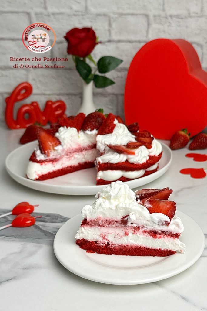 Gâteau cœur sans moule de Saint-Valentin facile et rapide, vraiment délicieux avec une base de biscuit red velvet préparée avec peu d’ingrédients simples, moelleux et fondant, sans graisses et sans levure. J’ai décidé de l’imbiber un peu pour parfumer la base, mais ce ne serait même pas nécessaire, j’ai choisi un sirop à l’alchermes. Pour la garniture, une crème rapide avec de la ricotta de brebis et de la crème fouettée, et pour la décoration, qui ne sont pas seulement un décor, mais apportent beaucoup de goût et d’arôme, des fraises fraîches, et je dois vous avouer que pour être les premières de la saison, je les ai trouvées vraiment délicieuses, douces et très savoureuses. J’ai décidé de préparer ce gâteau pour la Saint-Valentin, désormais le 14 février fête de tous les amoureux est de plus en plus proche, mais il est si facile et bon qu’on peut le faire pour de nombreuses autres occasions, même comme gâteau d’anniversaire, on peut le préparer rouge ou sans colorant, en forme de cœur, ou même en simple cercle ou chiffre, en utilisant une silhouette appropriée, j’ai découpé un cœur en le dessinant sur une feuille A4 que j’ai ensuite pliée en deux et découpée avec des ciseaux. J’ai posé la feuille sur la base et je l’ai découpée avec un couteau. Facile n’est-ce pas ? Alors préparons-le ensemble.