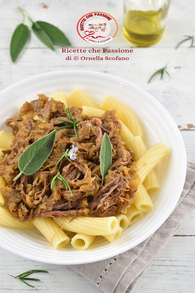 Genovese napolitaine, une délicieuse sauce à base d’oignons et de viande de bœuf, typique de la cuisine napolitaine — le terme « genovese » peut prêter à confusion, même s’il existe probablement un lien avec Gênes. Il y a plusieurs légendes et théories à ce sujet ; la plus probable est que, autrefois, des cuisiniers génois travaillaient dans les nombreuses auberges du vieux Naples et préparaient sans doute le tocco, un plat similaire, et les Napolitains, attirés par son parfum, l’appelaient simplement genovese, en faisant référence à leur cuisine. Au fil des siècles, ce plat est devenu une spécialité partenopea : il suffit de dire « genovese » pour savoir qu’on parle d’une délicieuse douceur, d’une sorte de ragoût, ou plutôt d’une confiture salée d’oignons, cuits lentement avec de la viande de bœuf — on privilégie le paleron, ou aussi la poitrine ou l’épaule, riches en tissu conjonctif, qui avec la cuisson lente dégagent tout leur arôme et donnent une viande très tendre. En général, on nappe les pâtes avec cette sauce ; par tradition, des ziti cassés à la main, un format que mon père adorait (moi un peu moins), mais la genovese est aussi délicieuse sur une tranche de pain rustique. Voyons comment la préparer.