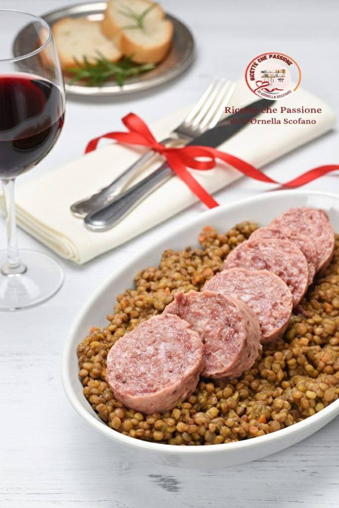 Lentilles avec cotechino, le plat riche et substantiel qui ne peut pas manquer au réveillon du Nouvel An, préparé avec des lentilles et cotechino ou en alternative avec zampone, lequel des deux préférez-vous ? On part d’un bon plat de lentilles, ne prenez surtout pas celles en boîte, très mauvaises, mais parfaites les lentilles sèches à cuire rapidement, en environ 40 minutes sans besoin de les faire tremper, avec peu et simples arômes, oignon, carotte et céleri, et si vous aimez, un peu de tomate, passée ou concentrée, surtout peu d’huile, extra vierge d’olive, et mieux une cuillère à cru. Le cotechino est facile à cuire, dans de l’eau bouillante dans un sachet sous vide, cela prendra encore moins que les lentilles, et pendant que les deux cuisent, même à l’avance, pour les réchauffer au dernier moment, vous pouvez faire beaucoup d’autres choses pour préparer un parfait réveillon du Nouvel An. Alors voyons en détail comment préparer ce plat traditionnel, incontournable car considéré comme un plat riche et porte-bonheur pour la nouvelle année, comme symbole de richesse et prospérité. En attendant, voici quelques idées pour des entrées savoureuses à préparer pendant la cuisson des lentilles.