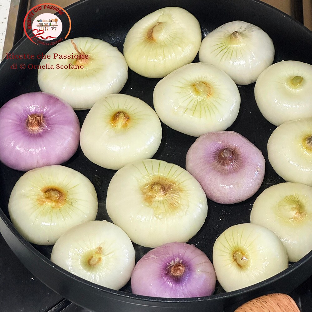 Mettons dans une poêle antiadhésive un filet d’huile d’olive, ajoutons les oignons grelots nettoyés et lavés et laissons dorer à feu moyen-élevé. Il est important de bien les laisser dorer quelques minutes. Ajoutons les épices.