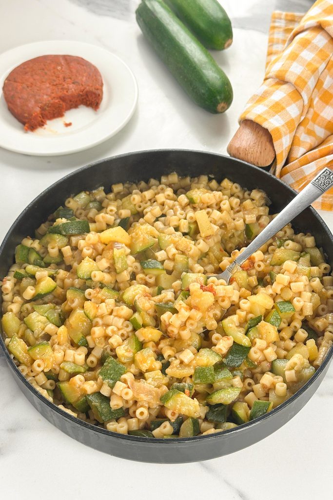 Les pâtes aux courgettes et ‘nduja sont trop bonnes, crémeuses, chaudes et enveloppantes. Dernièrement, je fais peu de pâtes mais quand j’en prépare, elles doivent être délicieuses, et avec cette idée, je me suis lancée dans la préparation de pâtes riches avec des courgettes, des pommes de terre et des oignons, où les courgettes sont prépondérantes, pour un plat sain et léger mais en même temps réconfortant. Cherchant un peu dans le frigo, j’ai vu le morceau de ‘nduja que j’avais pris pour les fêtes et que je n’avais pas encore touché, et je me suis dit, voilà, aujourd’hui mon plat réconfortant par ce jour froid et pluvieux sera les pâtes à la ‘nduja, mais pas avec une simple sauce tomate, mais avec plein de légumes cuits à la poêle, et dans lesquels je cuis aussi les pâtes, pour que cela devienne un tout, lié et amalgamé, qui est une explosion de goût et de bonté. Si vous voulez les préparer avec moi, allons directement à la recette.