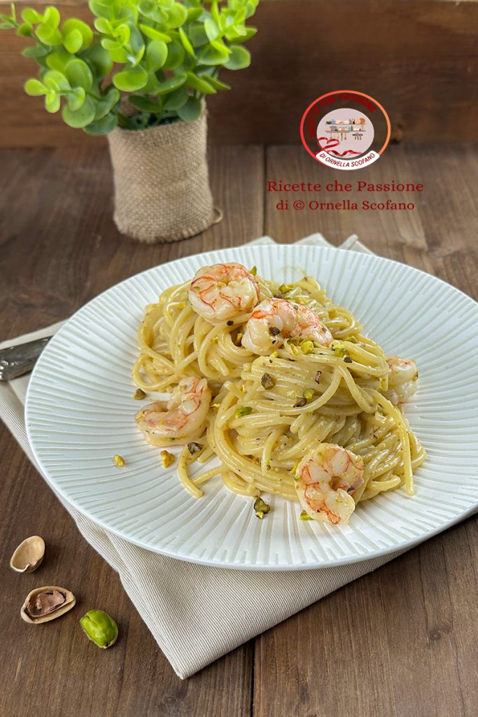 J’ai cuit les pâtes bien al dente dans de l’eau bouillante et salée, j’ai terminé la cuisson dans la poêle avec les crevettes, en ajoutant un peu d’eau de cuisson des pâtes. J’ai sauté pendant une minute puis j’ai éteint le feu et ajouté le pesto de pistaches, j’ai ajusté la crémeux avec l’eau de cuisson des pâtes.