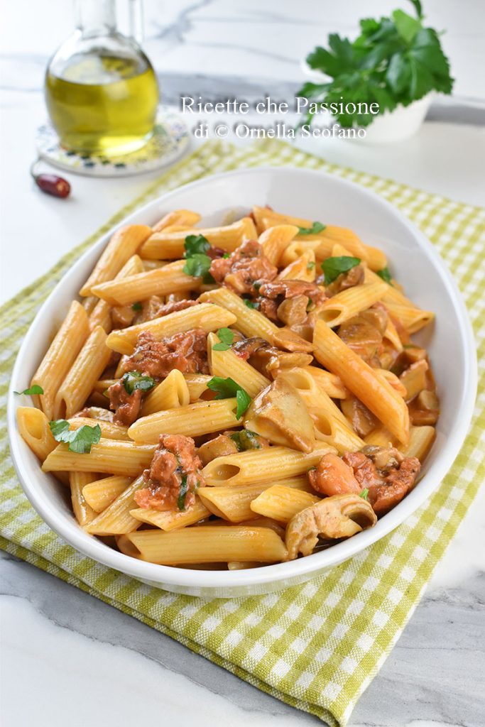 Pâtes avec ragù de saucisse et cèpes, un des plats classiques que l’on peut manger en Calabre, mais que vous pouvez également préparer chez vous. Il suffit de très peu pour le préparer et il peut être fait chaque jour de la semaine, sans attendre forcément le déjeuner du dimanche pour savourer un riche plat principal. Pour la recette, j’ai utilisé des simples penne rigate, mais les fusilli ou de bonnes pâtes fraîches maison, comme les macaronis calabrais, souvent appelés fileja, sont également parfaits. Pour la recette, impossible de se passer, du moins chez moi, de la saucisse calabraise, la saucisse rouge au fenouil sauvage, mais je vous assure que vous dégusterez un excellent plat même si vous utilisez un autre type de saucisse, à condition qu’elle soit délicieuse. Évidemment, pour un bon ragù aux champignons, il faut des cèpes des bois. Je vais les cueillir moi-même, et si j’en trouve beaucoup, je les congèle, déjà nettoyés et prêts à être découpés. Ainsi, même quand je reviens bredouille, je peux me régaler de ma délicieuse pâte au ragù de cèpes et saucisse. Alors, allons en cuisine pour la préparer, et n’hésitez pas à utiliser la saucisse de votre région et les cèpes que vous pourrez trouver, frais ou surgelés, l’important est que ce soient des ingrédients de qualité.