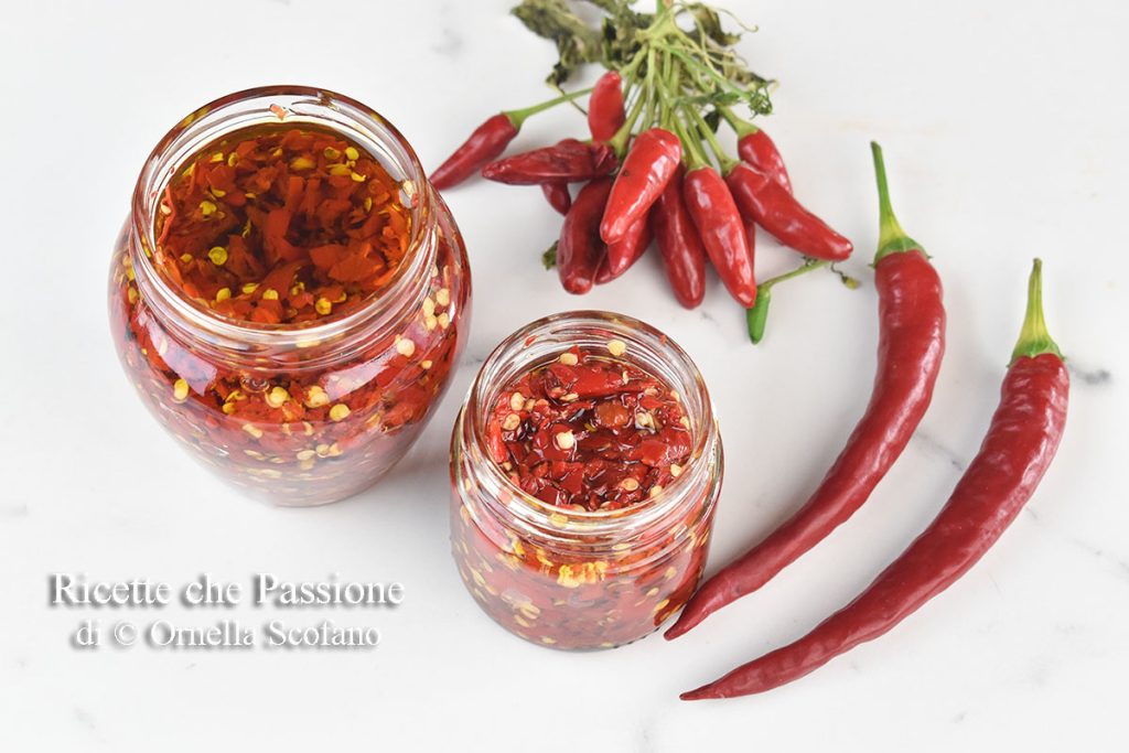 Piment haché sous huile, une conserve typique de la cuisine calabraise à base de piment piquant haché, préparé avec du sel et du vinaigre pour réaliser une conserve de piments frais à longue conservation, sous huile, en effet ces piments peuvent se conserver plus de 2 ans. J’adore avoir chez moi des petits plants de piment, même si je n’ai pas de jardin potager, j’essaie de placer quelques petits plants en pot, ou dans le jardin entre des bougainvillées. Cette année, avec seulement 2 petits plants, j’ai eu une récolte abondante et je me suis amusée à préparer de nombreuses conserves différentes à base de piment. J’ai congelé les derniers piments pour les avoir frais, pendant les journées plus chaudes j’en ai séché quelques-uns bien rouges et mûrs, beaucoup d’autres je les ai utilisés pour préparer les piments entiers sous huile, et aussi la bomba calabraise ou piccadilly que nous utilisons beaucoup pour garnir les bruschettas ou pour assaisonner nos plats. Le piment haché sous huile peut aussi être utilisé en cuisine pour enrichir avec ce goût piquant tous les plats que nous aimons le plus, mais il peut aussi enrichir nos bruschettas, parfait à utiliser dans toutes les recettes où l’utilisation de piment frais est prévue, par exemple dans de délicieuses pâtes à l’ail, huile et piment, mais il peut aussi être utilisé sur les plats finis pour donner un goût plus prononcé.