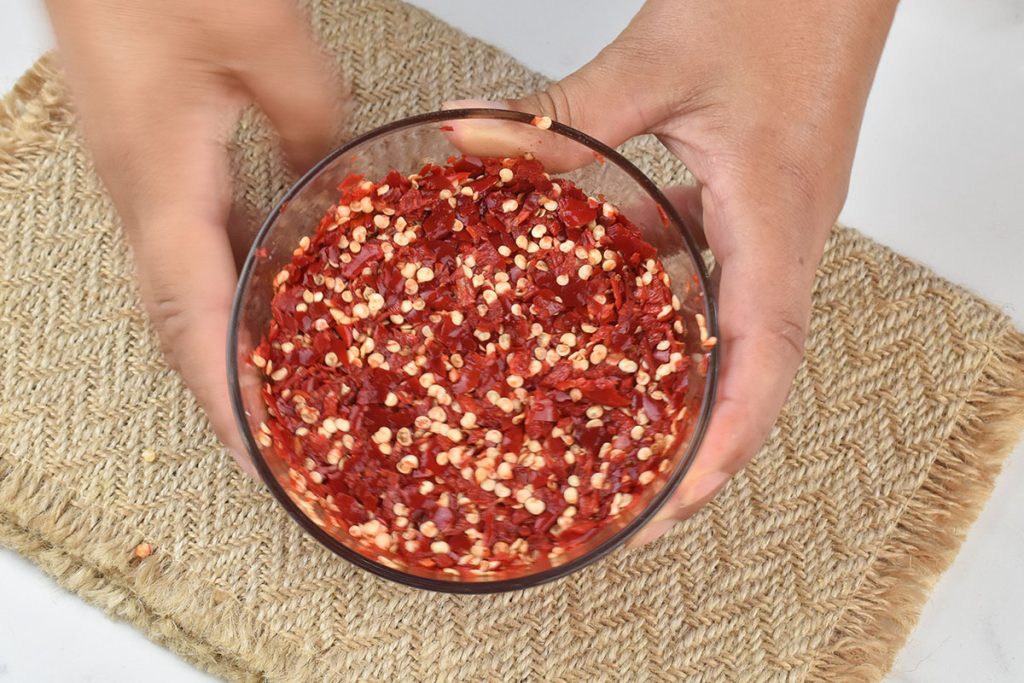 2. Hachez avec un hachoir de manière grossière les piments, vous pouvez aussi ajouter une gousse d’ail pelée. Placez dans un bol et salez, mélangez et couvrez avec un poids. Laissez ainsi pendant 12 heures.