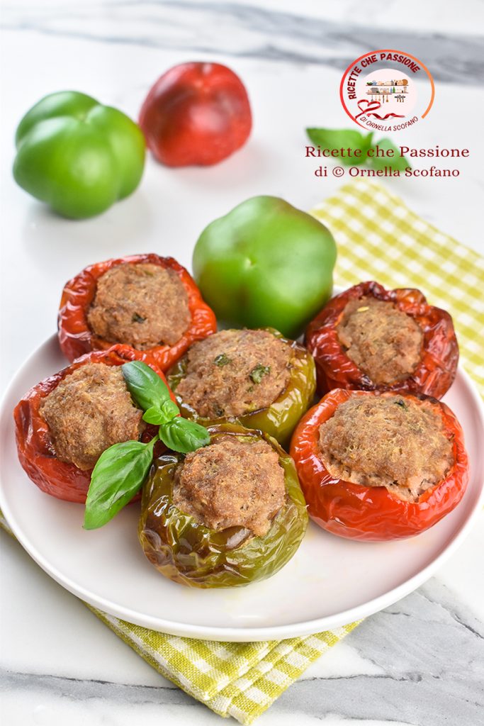 Saupoudrez l’intérieur de chaque poivron d’un peu de sel fin, puis farcissez avec la farce pour boulettes que nous avions préparée et mise à reposer entretemps, recouverte de film, au frigo.