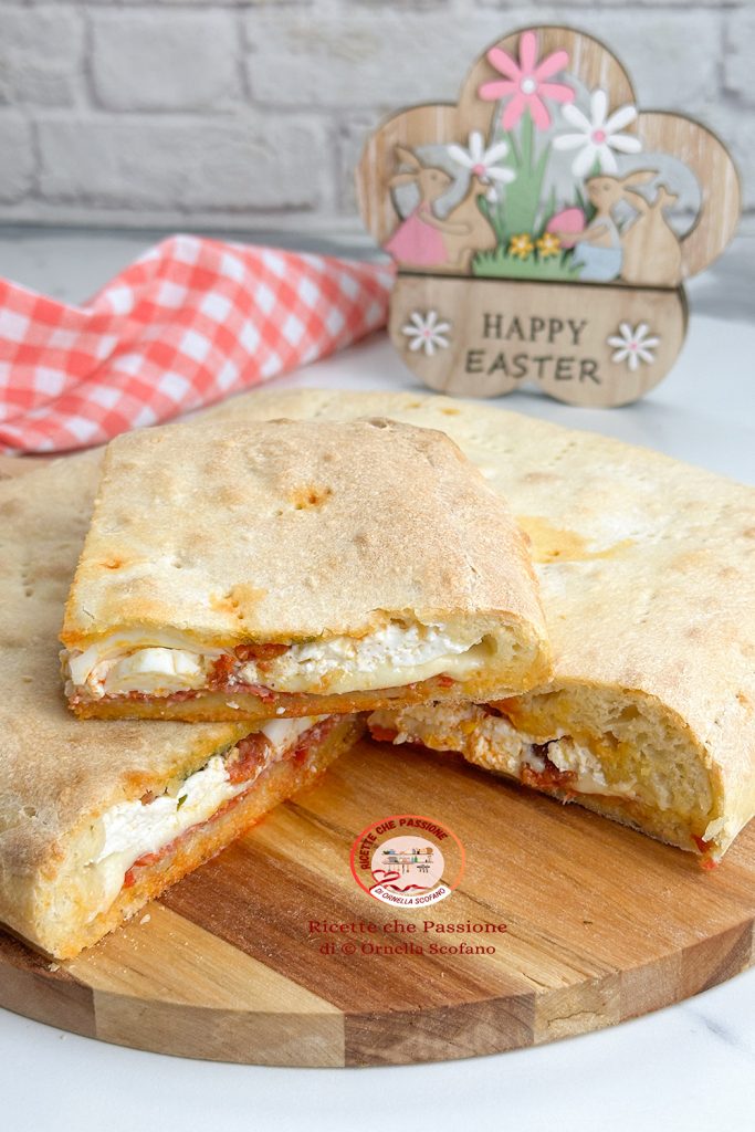 Pâques arrive et en Calabre, c’est la tradition de faire la pitta chjina au four à bois. Le nom de la pitta chjina peut varier selon la localité, à Lamezia Terme, elle est connue sous le nom de guastella, dans le cosentino mbignulata, mpiulatu ou mbiulata, et peut légèrement différer d’une localité à l’autre pour les ingrédients utilisés dans la farce, par exemple dans le lametino on utilise les couennes cuites, tandis que dans le cosentino on utilise les frisuraglie, qui sont les gratons de porc. La base est une pâte à pain, avec de la farine de blé dur, travaillée à la main et cuite au four à bois. Pour ma part, je la prépare dans le four de la maison, j’ai expérimenté et testé ma pâte préférée, une pâte de semoule pour focaccia. J’utilise peu de levure, de la farine 0 et de la semoule de blé dur remoulue, et j’ajoute juste un filet d’huile pour la rendre bien dorée et croustillante à l’extérieur, tandis qu’à l’intérieur elle reste très moelleuse. Reprenons maintenant la farce qui mérite une mention particulière. La farce est constituée de tous les ingrédients typiques calabrais qui se trouvent pendant la période de Pâques. Charcuteries faites maison, comme c’était la tradition calabraise, soppressata et saucisse séchée, fromage de brebis de quelques jours, et ricotta de brebis fraîche, œufs durs, des poules du poulailler, qui ne manquaient jamais, et puis des gratons ou des couennes et beaucoup de persil. Une farce somptueuse et riche, qui après la longue période de carême, de privations et de sacrifices, symbolisait un vœu d’abondance et de bonne récolte pour les mois à venir, avec la récolte du blé et de toutes autres productions ou élevages. Le rite du pain de Pâques voyait les familles se réunir aux fours, pour préparer des pains en grande quantité, imaginez que l’on pétrissait 20 kg de farine par famille, puis ceux qui le préparaient avant en offraient aux voisins qui ne l’avaient pas encore préparé ou peut-être ne pouvaient pas le préparer parce qu’ils n’avaient pas de four, ou parce qu’ils étaient en deuil, et en signe de douleur, ils se privaient de tout plaisir. Même si nous sommes en 2025, dans de nombreux quartiers de campagne le rite du pain de Pâques reste, en fait moi aussi presque chaque année je retourne à la campagne chez ma maman et nous allons préparer le pain de Pâques au four de la voisine, nous le préparons pendant la Semaine Sainte, entre le jeudi et le samedi de manière à nous organiser avec les autres qui font le pain au même four, en général nous prenons toute une matinée pour enfourner, défourner, garnir, et goûter, on prépare en même temps et dans cet ordre, pizza, pain et pitta chjina et enfin aussi les desserts, les mythiques cuzzupe ou cuddura cu l’ova de Pâques ne manquent jamais.