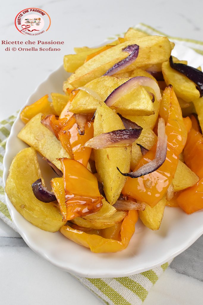 Quel délice les pommes de terre avec poivrons et oignons à la poêle, recette typique calabraise, un plat de pure poésie préparé avec peu d’ingrédients simples, sans arômes ni épices, juste de l’huile et du sel. Quand je ne sais pas quoi mettre sur la table, je prépare souvent un bon plat de pommes de terre, celles du jardin, sinon des pommes de terre pour la friture, ou pour les gnocchis, excellente la pomme de terre de la Sila. Ainsi, il sera facile de mettre sur la table rapidement un plat délicieux qui rend tout le monde heureux, et puis de temps en temps, une bonne friture fait du bien aussi, n’oublions pas. Si l’on ne voulait pas faire de friture, on peut toujours le faire au four, il suffit de précuire rapidement les pommes de terre dans l’eau bouillante, quelques minutes, puis de tout mettre au four, avec l’oignon coupé assez gros, pour ne pas le brûler, ainsi que le poivron.