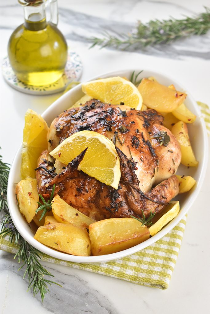 Le poulet rôti à l’orange avec des pommes de terre est un délicieux plat principal de la cuisine italienne, facile à préparer et vous sortez tout ensemble : le poulet juteux, tendre et très savoureux, avec les pommes de terre succulentes, cuites dans le même plat avec tous les jus libérés par le poulet. Pour les fêtes, ce sera le plat parfait à mettre sur la table, majestueux et succulent, vous ferez sensation avec un minimum d’effort, il suffira de mettre le poulet dans le plat, de l’assaisonner et ensuite le four fait tout seul, vous n’avez rien à faire, jusqu’à ce qu’il soit cuit et doré à point comme vous aimez. Alors voyons comment préparer ce délicieux petit poulet rôti, cuit entier, à l’orange, avec des pommes de terre au four.