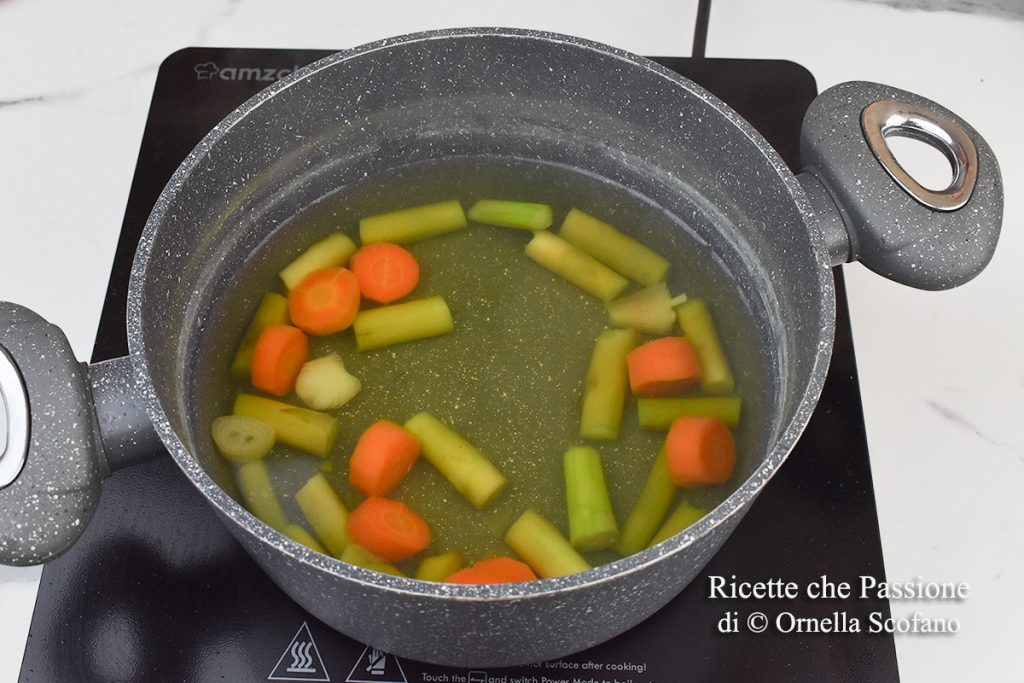 Préparons le bouillon pour notre risotto, avec environ deux litres d’eau, un demi-oignon, une demi-carotte en tranches, pelée avec un éplucheur, et utilisons également les tiges dures que nous avons mises de côté, en enlevant seulement la base où elles avaient été précédemment coupées, en coupant une fine tranche.