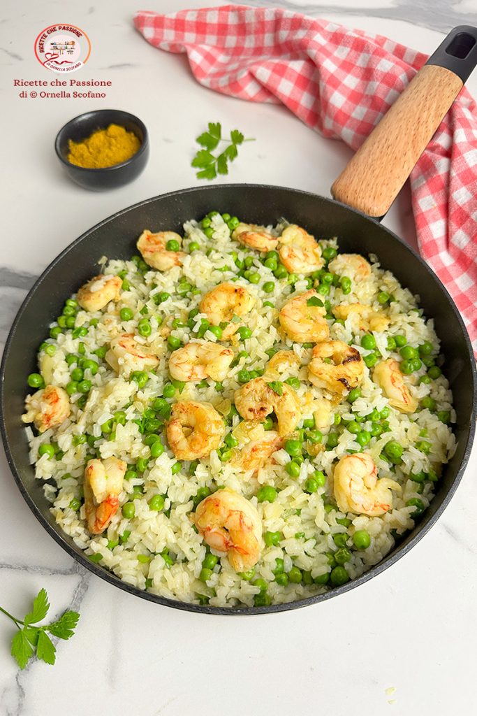 Quel délice, le riz sauté à la poêle avec des crevettes et des petits pois, encore plus savoureux au curry : il se prépare en quelques minutes et c’est un plat complet et équilibré, parfait même pour ceux qui font attention à leur ligne. Je l’ai préparé l’autre jour en rentrant de la salle de sport : après un bel entraînement intense, pour reprendre des forces j’ai préparé une belle assiette de riz, complétée par des petits pois au beurre, juste un peu pour les rendre spéciaux, et des crevettes sautées rapidement à la poêle avec de l’oignon et du curry, quelques ingrédients juste pour sublimer le goût. J’ai évité le vin et autres parfums pour garder un plat simple, savoureux et sans trop de contrastes. C’est un plat parfait à refaire souvent, parce qu’il est facile, rapide et en plus bon pour la santé. On peut aussi remplacer les petits pois par des courgettes si on veut, mais moi en général je compense le soir avec plein de légumes.