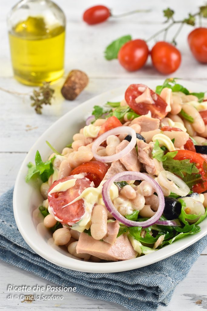 Salade de haricots au thon avec roquette et tomates cerises qui enrichit ma collection de recettes estivales avec légumineuses, des salades de légumineuses parfaites pour la chaleur estivale. Aujourd’hui, je l’ai préparée avec des haricots cannellini précuits, mais vous pouvez également utiliser des secs et les cuire à l’avance selon la recette ici cuisson des haricots, avec une casserole en terre cuite ou traditionnelle. J’ai enrichi la salade avec des filets de thon à l’huile d’olive, qui donnent un goût vraiment agréable à la salade de haricots, mais en même temps, ils l’enrichissent de protéines, essentielles pour un régime équilibré, et pour compléter le plat, et le rendre un parfait plat unique, beaucoup de roquette, des tomates cerises, puis moi qui suis calabraise et adore l’oignon rouge de Tropea, j’en ajoute toujours un peu, avec quelques olives. Si vous voulez enrichir le goût de la salade, un peu de mayonnaise donnera la touche finale, si vous voulez, vous pouvez également préparer rapidement la mayonnaise maison avec la recette ici mayonnaise maison.