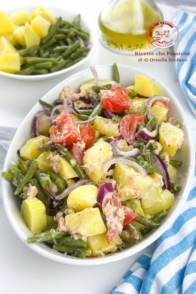 Salade de pommes de terre et haricots verts au thon délicieuse, avec des olives, pignons de pin, câpres et raisins secs, une recette rapide à préparer en quelques minutes mais très, très gourmande. Un bon plat unique sans saison, à préparer toute l’année, avec des haricots verts frais ou surgelés. Elle peut être dégustée chaude ou froide, je l’ai faite et mangée, le temps de la mettre sur la table elle était déjà froide, considérant qu’aujourd’hui il faisait 13 degrés, et elle est toujours agréable, et puis avec le thon et tous les ingrédients que j’ai ajoutés, cela en fait une salade riche et vraiment délicieuse, parfaite comme plat unique pour 2 personnes ou comme accompagnement ou plat principal pour 4 avec les mêmes quantités, mais il ne manque rien pour la considérer comme un bon plat unique, il y a les glucides des pommes de terre, les légumes, et les protéines du thon en boîte, peut-être abuser avec une double dose.