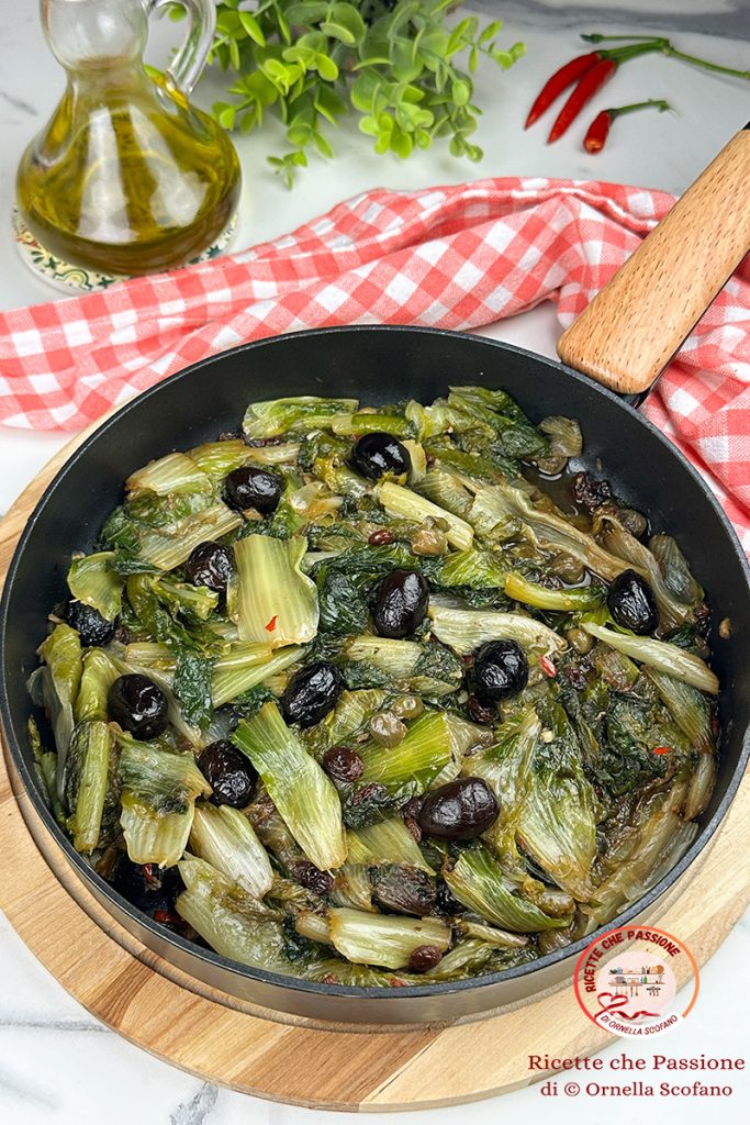Scarole à la napolitaine à la poêle, un accompagnement délicieux et facile à préparer, sans besoin de préalablement faire bouillir les scaroles, qui avec une cuisson rapide restent croquantes et conservent leurs propriétés. Pour préparer les scaroles à la napolitaine, nous avons besoin de quelques filets d’anchois, de raisins secs, d’olives, de câpres ou de pignons, d’ail et de piment. Les préparer est très simple, on fait un sauté à feu doux pour dissoudre les anchois dans l’huile chaude avec les autres ingrédients et puis on ajoute les scaroles lavées et coupées, à cru, il suffira d’ajouter les scaroles dégoulinantes après le lavage, ou d’ajouter un peu d’eau pour les cuire, avec couvercle, en quelques minutes. Alors voyons comment les préparer.