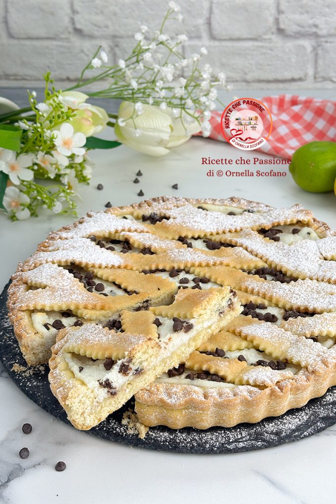 Une fantastique tarte à la ricotta avec des pépites de chocolat préparée avec une pâte sans beurre à l’huile d’olive extra vierge, simple et rapide à préparer, vraiment fantastique, à tel point que personne ne se rend compte qu’il y a de l’huile d’olive, pour un dessert plus sain et authentique avec une dose minimale de sucre. C’est toujours un dessert et il le reste, bon et gourmand mais sain et authentique avec des ingrédients simples et authentiques comme la bonne huile d’olive, la farine de blé tendre, les œufs frais et la bonne ricotta de brebis au goût unique, le tout enrichi de pépites de chocolat noir et de zeste de lime râpé qui apporte plus de fraîcheur à la pâte, que l’on peut facilement remplacer par du citron et/ou de la vanille. Voir les autres tartes