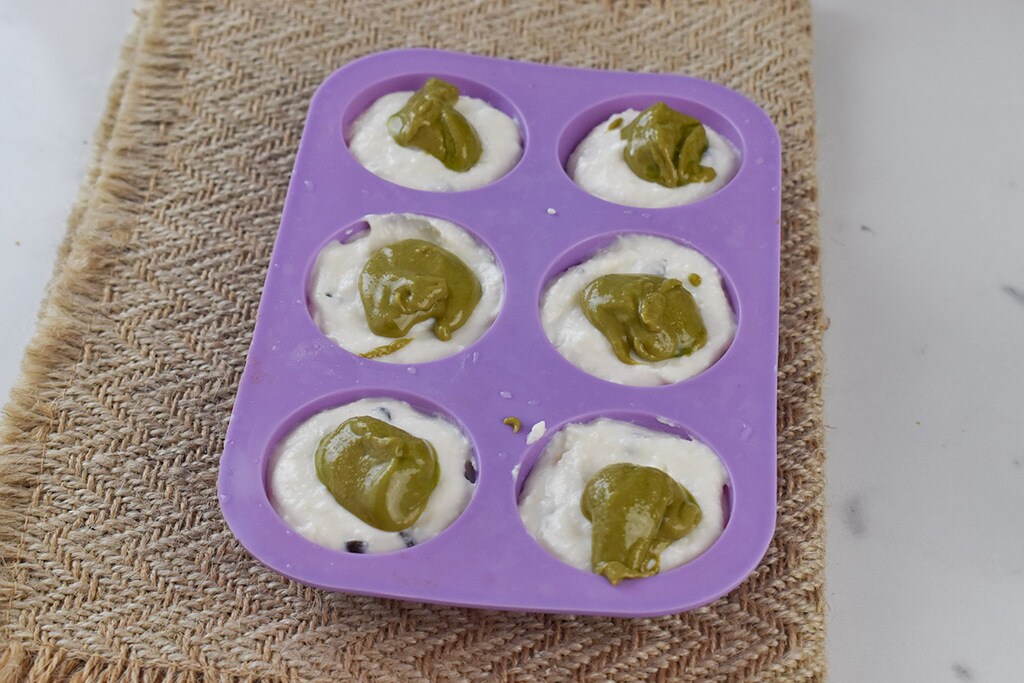 Remplissons le moule, cliquez sur le lien pour le trouver, avec 6 demi-sphères de crème de ricotta, comme on le voit aussi dans la vidéo. Ajoutons ensuite sur chacune une petite cuillerée de crème de pistache.