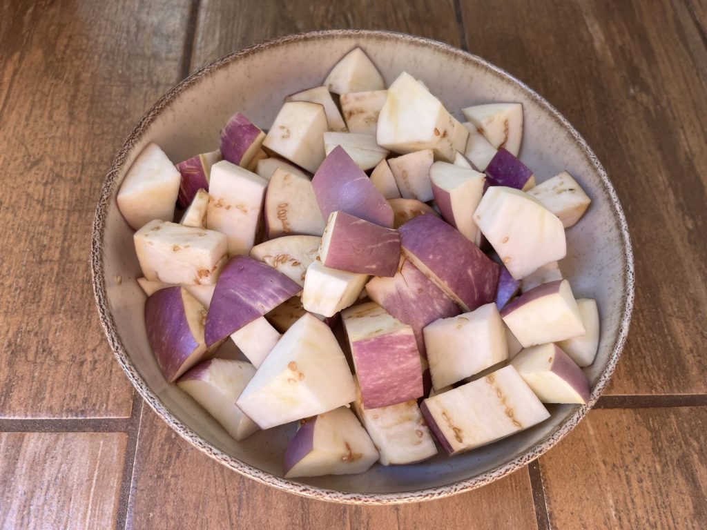 Sur une planche à découper, coupe les aubergines en deux puis en cubes réguliers et de même taille