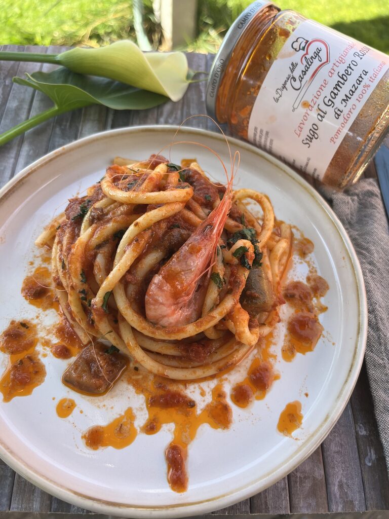 Les bucatini à la sauce de crevette de Mazara sont excellents également le lendemain réchauffés à la poêle avec un peu d’eau.