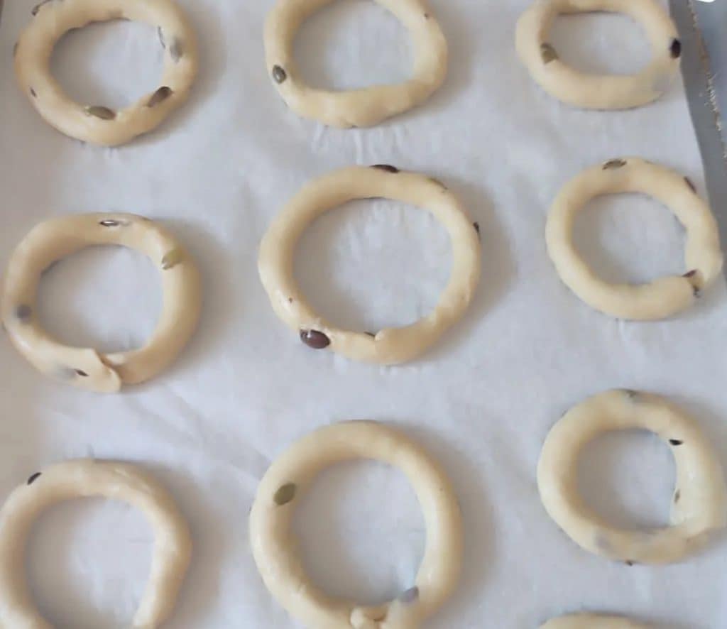 Passé ce temps, divisons la pâte en petits pains d’environ 80 grammes chacun, étirons-les en forme de grissini et joignons les deux extrémités pour former un cercle comme sur la photo.
