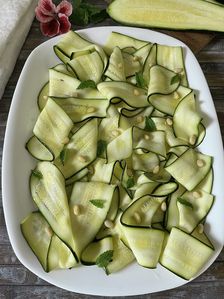 Le carpaccio de courgettes marinées au citron est un accompagnement frais et vraiment délicieux. Frais, car il est cru, il nous réjouit pendant ces journées d’été et nous apporte une bonne dose de minéraux et de vitamines.