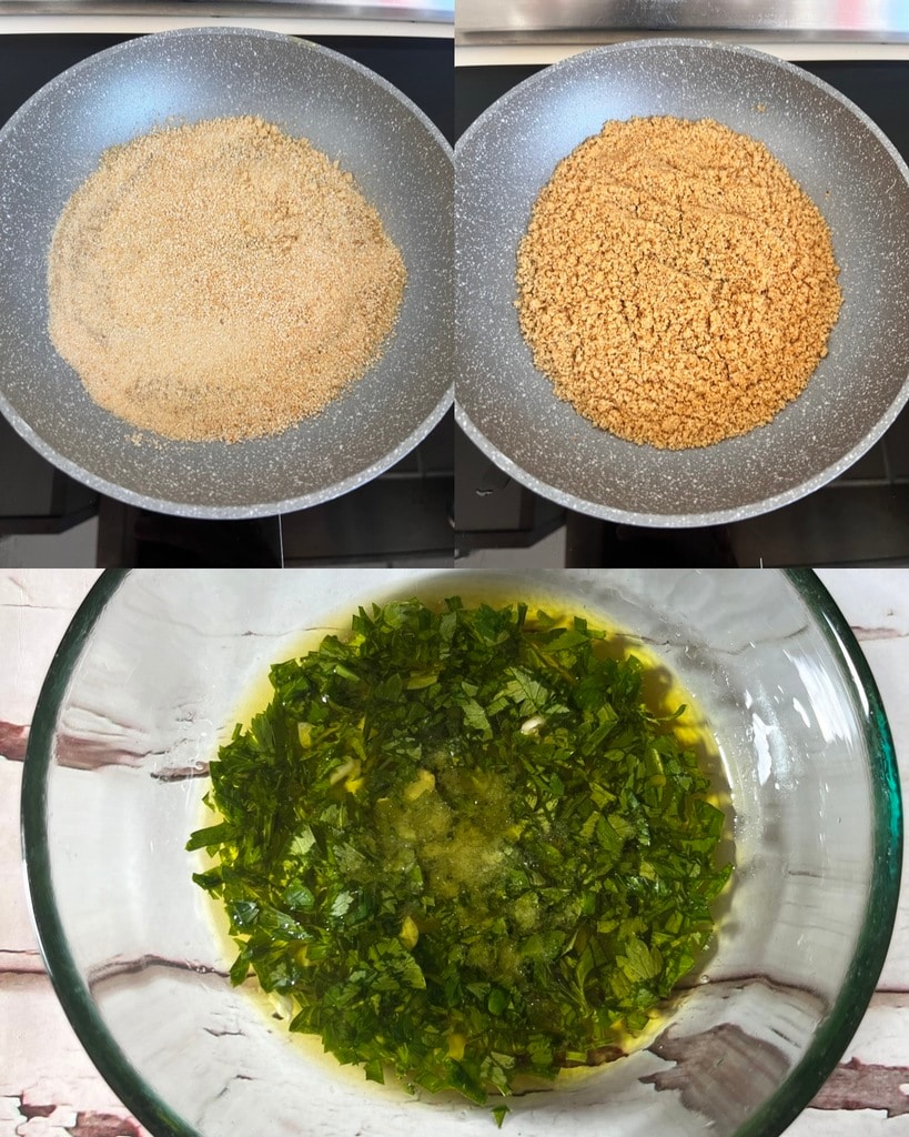 • Huile une poêle antiadhésive con de l’huile d’olive extra vierge et fais griller quelques minutes la chapelure en la remuant souvent pour éviter qu’elle ne brûle, jusqu’à ce qu’elle soit dorée.