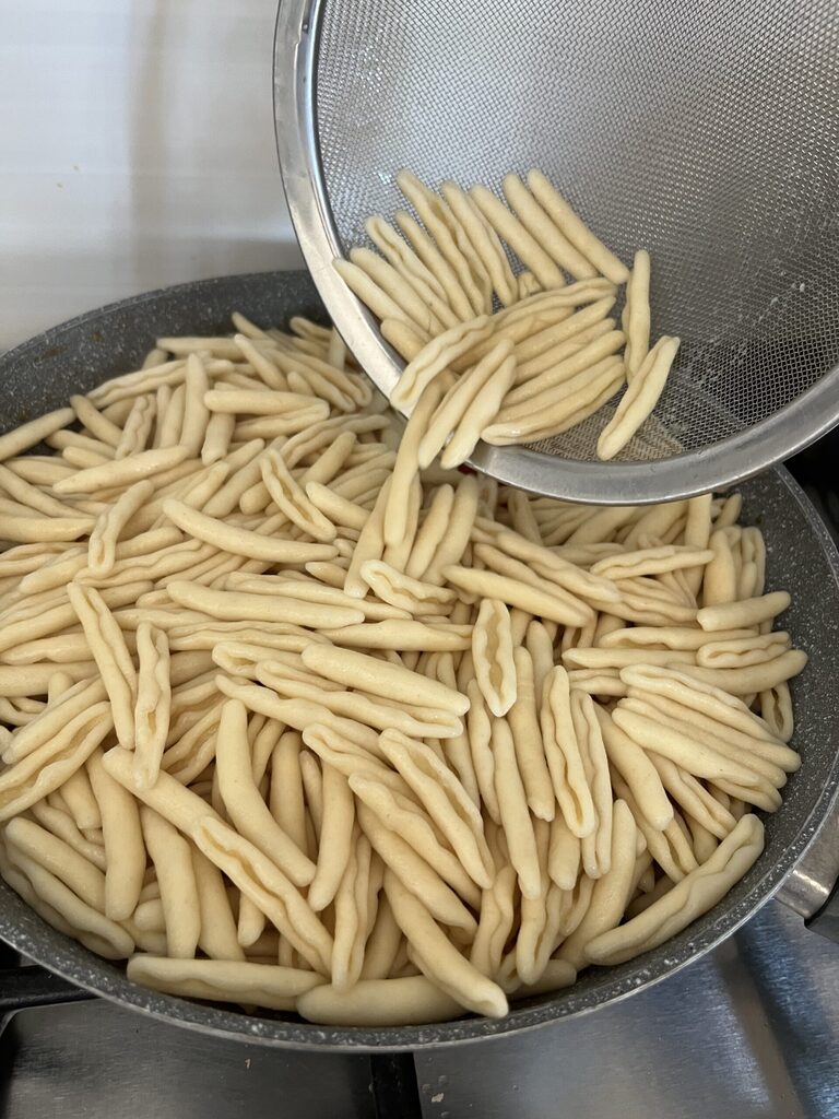 Comme les fantastiques cavatelli de forme longue et concave, qui recueillent facilement le pesto. Réalisés avec de la farine, de l’eau et de la semoule de blé dur, d’origine des Pouilles. Donc, tous des produits italiens et, je le répète, artisanaux.