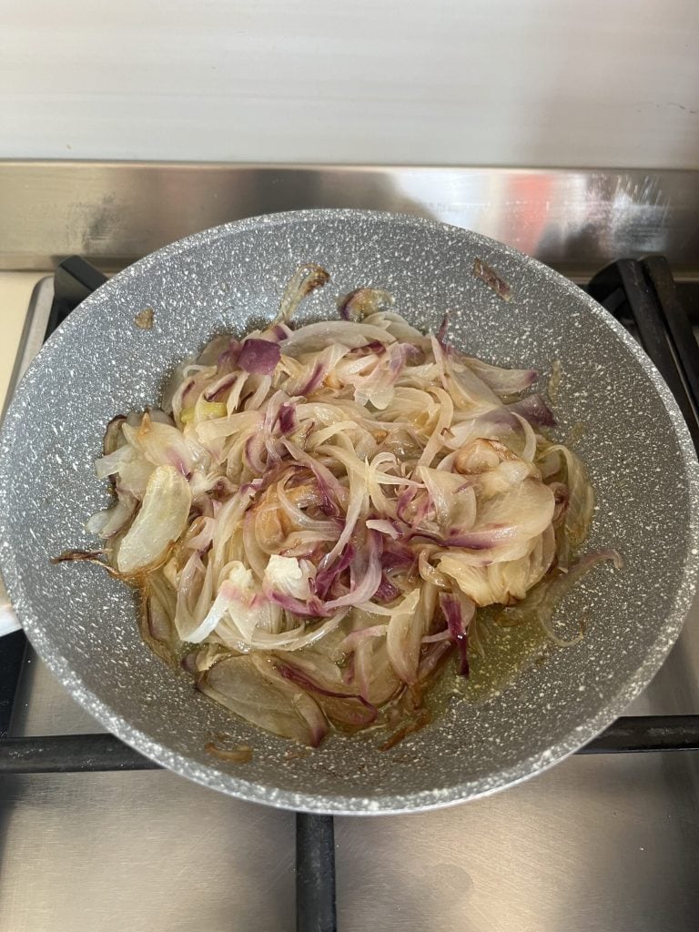 Pendant ce temps, dans une poêle antiadhésive, mettons un filet d’huile d’olive extra vierge et les gousses d’ail et faisons légèrement revenir. Une fois le sofritto prêt, retirons les gousses d’ail et ajoutons les oignons coupés en fines tranches, puis une pincée de sucre et les herbes aromatiques et faisons cuire environ cinq minutes, puis ajoutons le vin, le vinaigre et l’eau et faisons cuire encore 10 minutes.