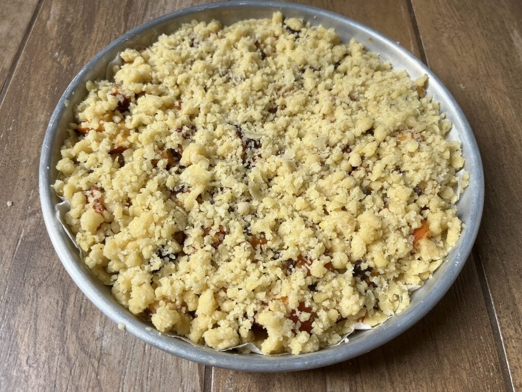 Recouvre avec les miettes restantes et enfourne à four statique pendant 30-35 minutes à 180 degrés ou jusqu’à dorure