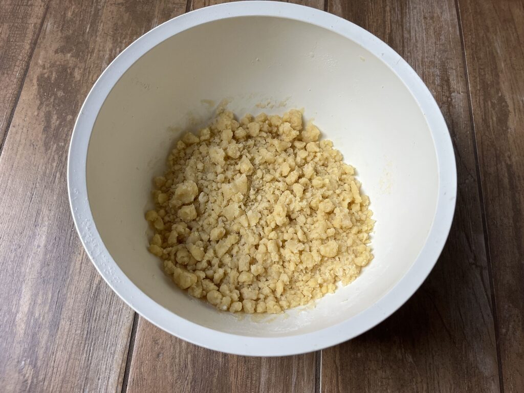 Avec une fourchette, casse les œufs et mélange grossièrement les ingrédients, puis continue à émietter avec les mains.
