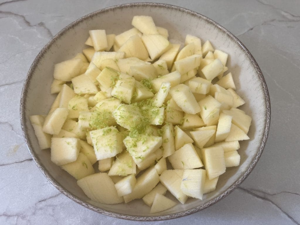 Coupez sur une planche à découper deux pommes en cubes et ajoutez le zeste râpé d’un citron
