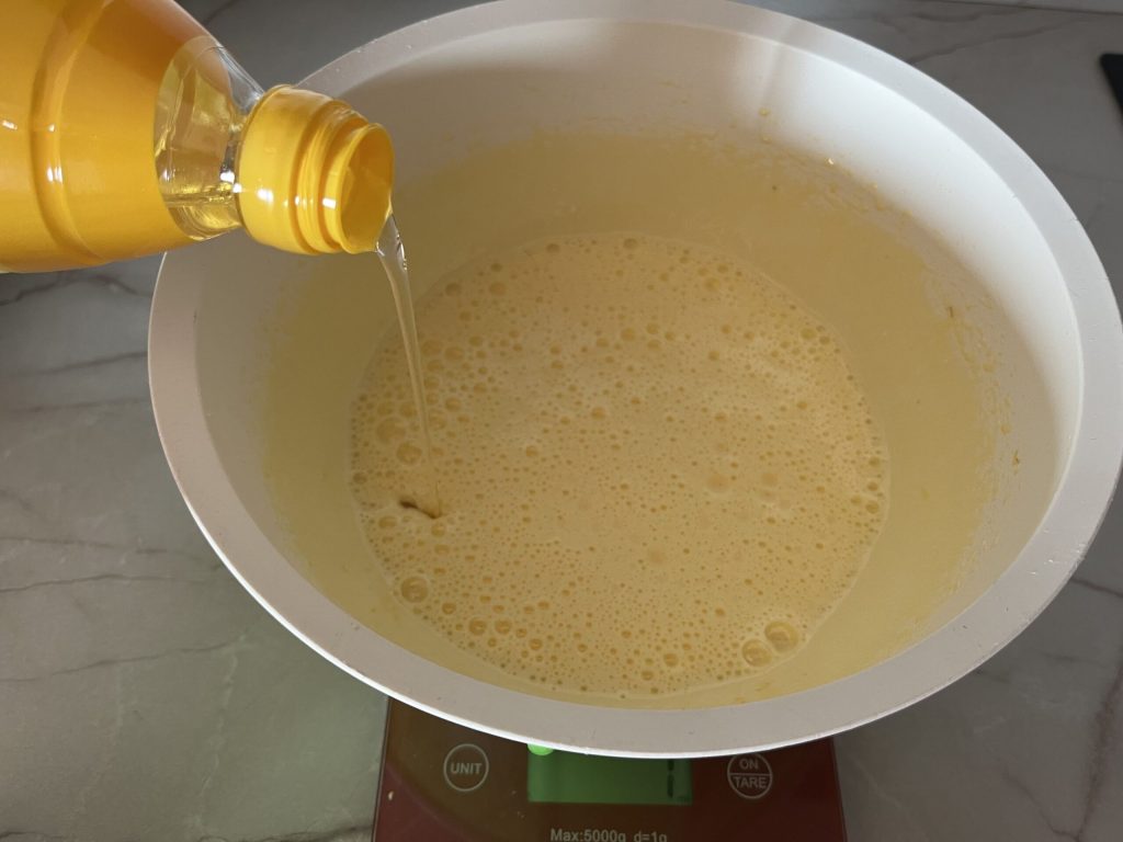 Tout en maintenant le fouet électrique en action, ajoute en filet l’huile de graines