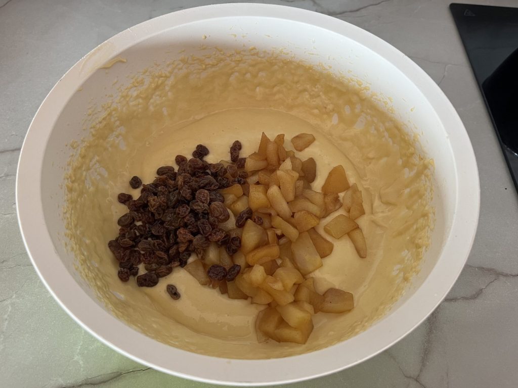 Et enfin, les pommes cuites à température ambiante et les raisins secs, et mélange bien.