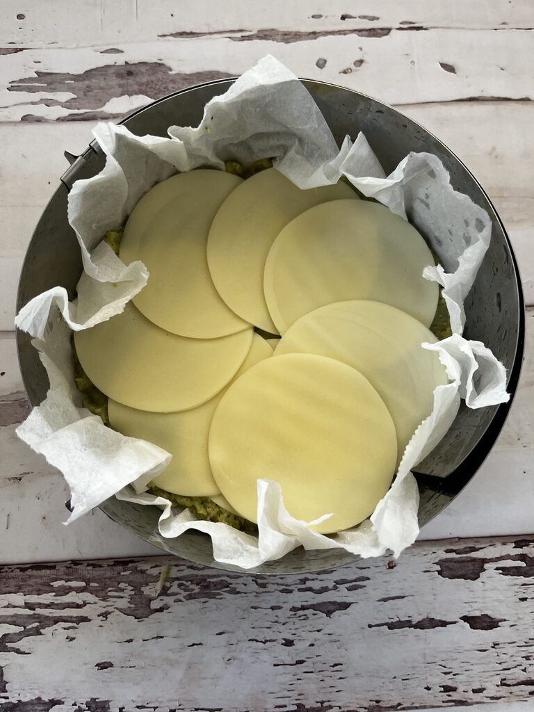 Recouvrons avec le reste du mélange et ajoutons le brie en morceaux et une pincée de parmesan râpé. Enfournez le tout à 180 degrés pendant environ 30 minutes et notre gâteau au cœur crémeux et fondant est prêt à être servi… bon appétit !