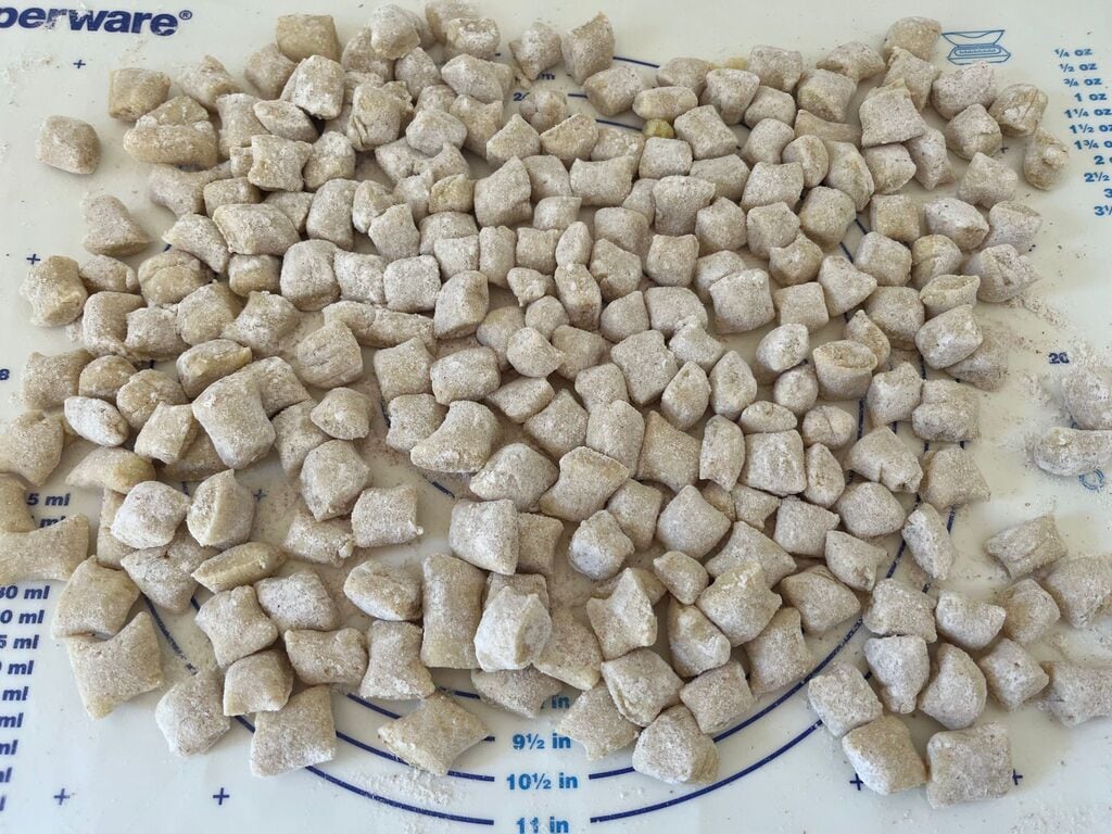 Ensuite, écrasons-les avec le presse-purée et déposons-les sur la planche à pâtisserie. ou une base d’appui. Ensuite, ajoutons la farine et commençons à mélanger avec les mains pour ensuite pétrir énergiquement pendant quelques minutes jusqu’à obtenir une pâte bien compacte. Ensuite, farinons-la bien, et avec un couteau coupons-la en tranches.