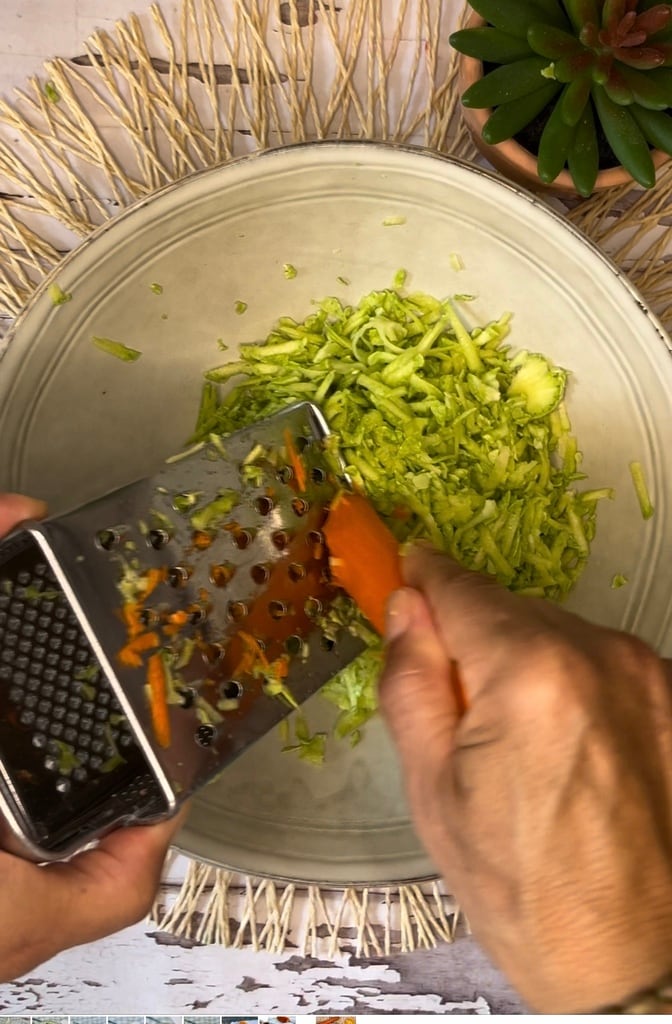Avec une râpe à légumes râpe les courgettes et les carottes dans un saladier.