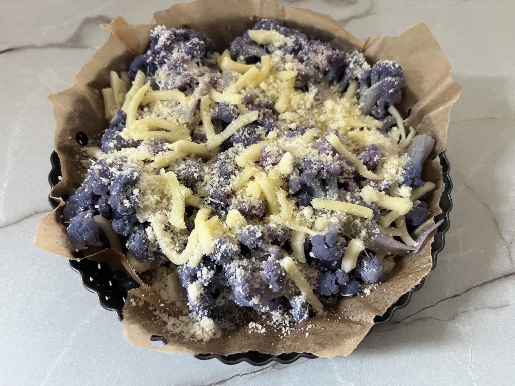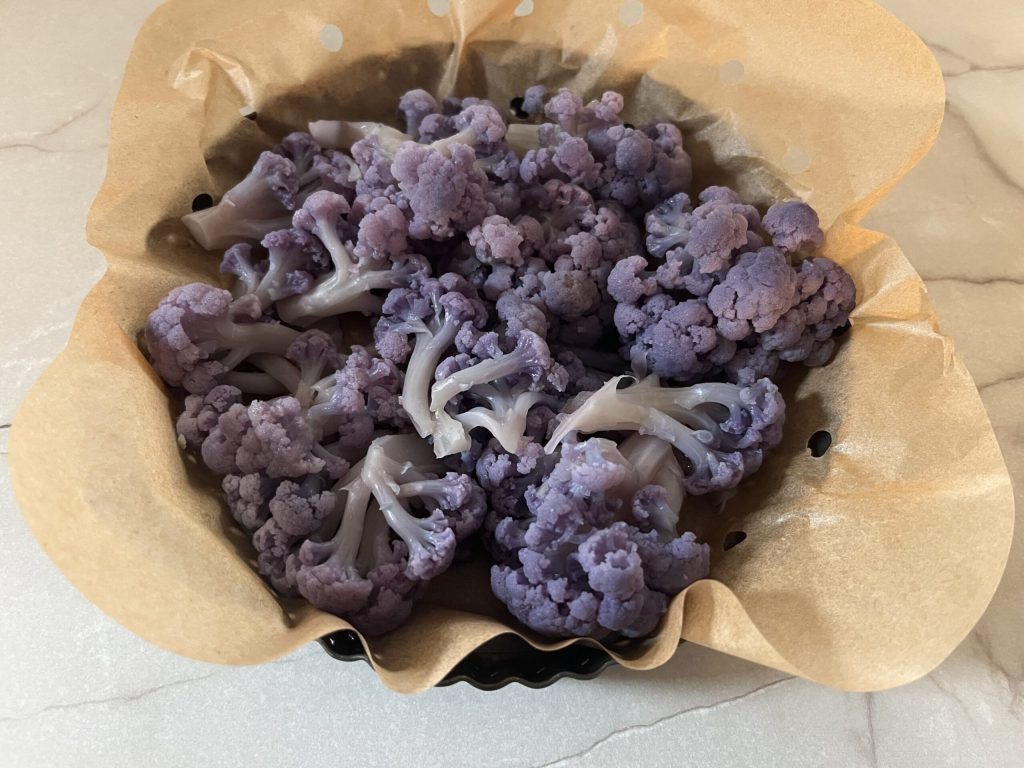 Pour préparer les délicieux brocolis violets gratinés à la friteuse à air, commence par laver soigneusement le chou-fleur sous l’eau courante. Coupe-le en bouquets et fais-le cuire dans une casserole avec panier vapeur pendant environ 8 minutes jusqu’à ce qu’ils soient tendres mais pas trop cuits.