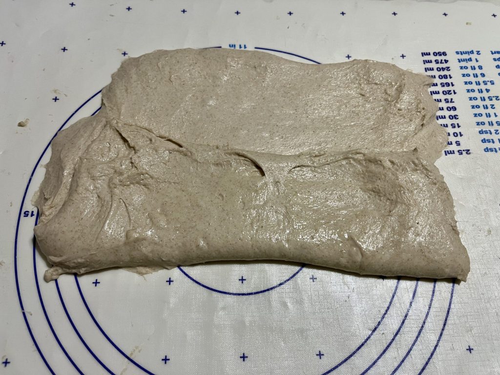puis le côté supérieur par-dessus. Maintenant la pâte est fermée sur elle-même. Laisse reposer à nouveau la pâte pendant 20 minutes supplémentaires et répète l’opération deux autres fois toujours en espaçant de 20 minutes. Puis transfère au frigo à 4 °C pour 24-48 heures.