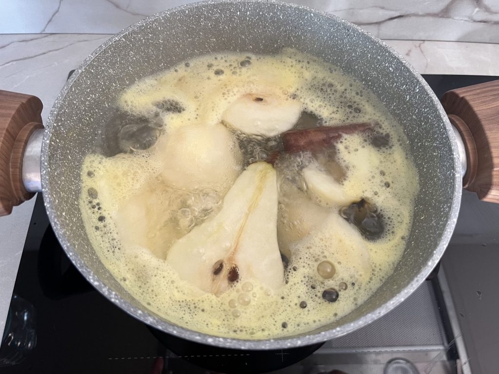 Les poires sont d’abord bouillies avec de l’eau et des épices, puis farcies et passées quelques minutes au four ou dans une friteuse à air.