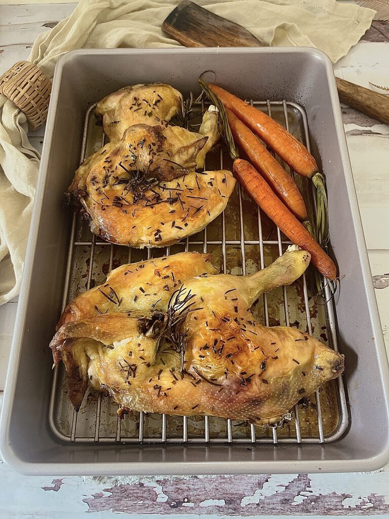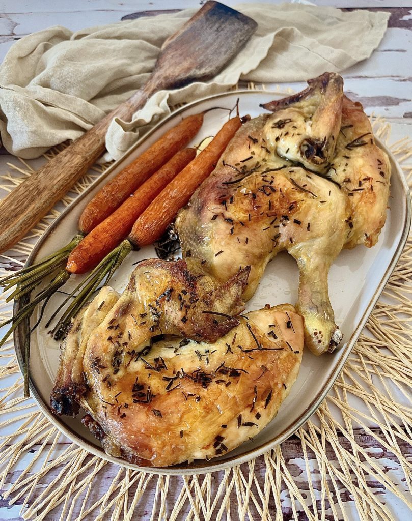 Le poulet peut être cuit entier ou en morceaux. Je l’ai cuit coupé en deux.