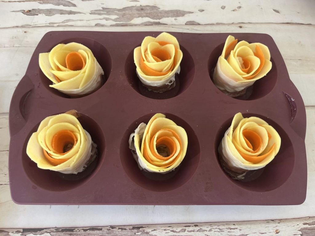 Placez à l’intérieur des moules à muffins et avec vos mains, écartez légèrement les pétales formés par les légumes en créant ainsi une rose. Aspergeons d’un filet d’huile d’olive extra vierge les pétales et salons. Enfournez à 200 degrés pendant environ 20 minutes, puis à 180 pendant encore 10 minutes, jusqu’à ce qu’il soit doré.